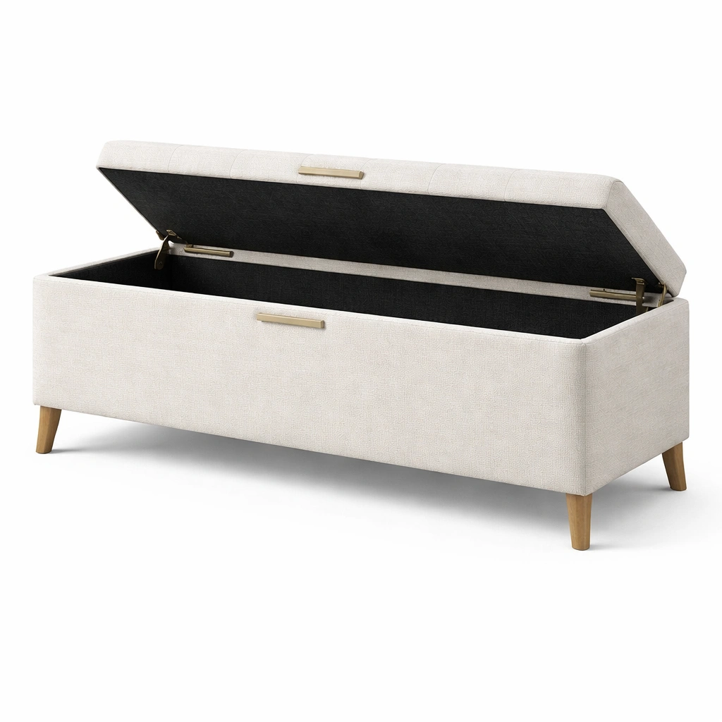 Este banco de almacenamiento tiene una estructura tapizada en tela de poliéster beige y patas de madera maciza. Incluye una tapa abatible que permite un fácil acceso a su interior.