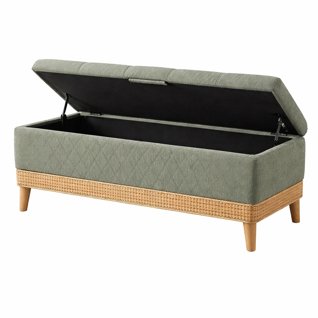 Banco de almacenamiento tapizado con tela de lino verde y base de ratán. Las patas son de madera maciza. Dimensiones: 120 cm de largo, 40 cm de ancho, 45 cm de alto. La tapa abatible permite un acceso fácil al espacio interno, ideal para guardar ropa, juguetes o accesorios pequeños. El banco soporta hasta 100 kg de peso.