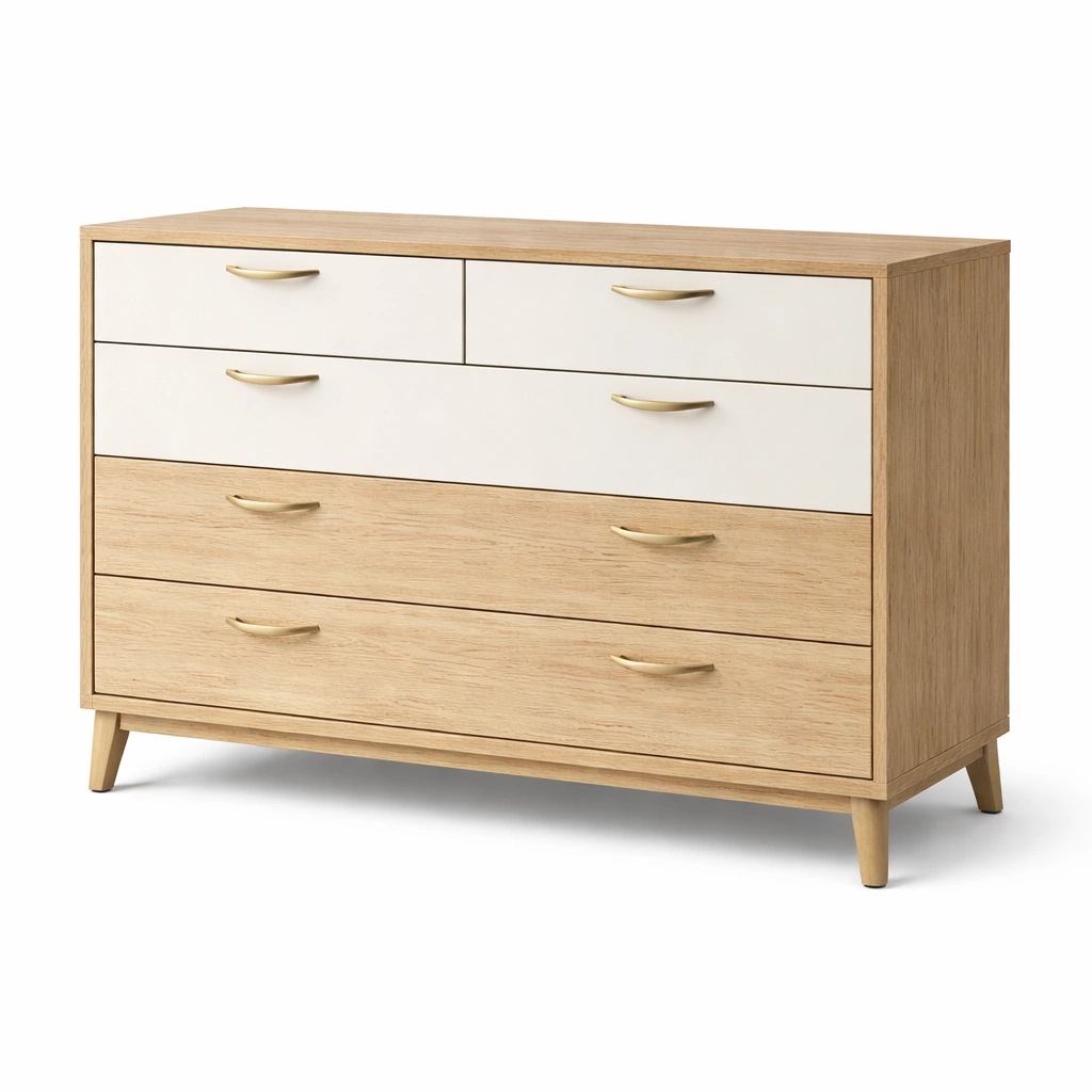 Funcionalidad: 5 cajones con deslizamiento y manijas doradas.
